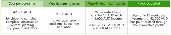 A drawback to wide adoption is the considerable upfront capital costs which includes the housing for the growing environment hand and the internal shelving structure to support the plants to be able to grow in the air. Additionally, many container farming solutions require high energy input from water reticulation, lighting and temperature control. Our future ready innovative farming concept is able to greatly reduce these prohibitive costs and ensure we can meet the demand requirements set for a smooth transition away from Global Food Supply Threats.